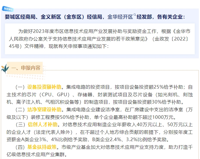婺城區(qū)經(jīng)商局、金義新區(qū)(金東區(qū))經(jīng)信局,金華經(jīng)開區(qū)經(jīng)發(fā)部,各有關(guān)企業(yè): 為做好2023年度市區(qū)信息技術(shù)應(yīng)用產(chǎn)業(yè)發(fā)展補(bǔ)助與獎勵資金工作,根據(jù)《金華市人...