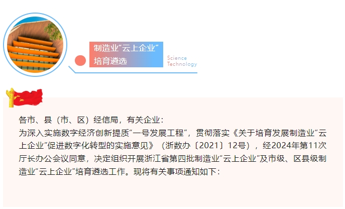 各市、縣(市、區(qū))經(jīng)信局,有關(guān)企業(yè):為深入實施數(shù)字經(jīng)濟(jì)創(chuàng)新提質(zhì)“一號發(fā)展工程”,貫徹落實《關(guān)于培育發(fā)展制造業(yè)“云上企業(yè)”促進(jìn)數(shù)字化轉(zhuǎn)型的實施意見》(浙數(shù)辦〔2021〕12號),經(jīng)2024年第11次廳長...