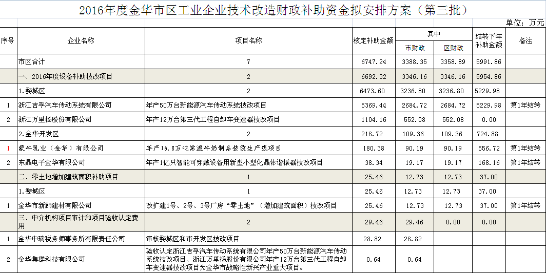 根據(jù)金華市人民政府《關(guān)于進(jìn)一步推進(jìn)工業(yè)有效投資的通知》(金政發(fā)〔2012〕92號)、《金華市人民政府關(guān)于加快培育現(xiàn)代產(chǎn)業(yè)體系打造先進(jìn)制基地的通知》(金政發(fā)〔2016〕40號)、《金華市人民政府辦公室關(guān)于支持工業(yè)企業(yè)技術(shù)改造有關(guān)政策的意見》(抄告單〔2016〕53號)和《關(guān)于申報(bào)2016年度金華市區(qū)工業(yè)企業(yè)技術(shù)改造補(bǔ)助資金的通知》(金經(jīng)信技投[2017] 32號)等文件要求,確定工業(yè)技改補(bǔ)助資金審計(jì)方式和擬安排方案。現(xiàn)已得出審計(jì)結(jié)果,并將擬支持的項(xiàng)目及補(bǔ)助金額公示如下: