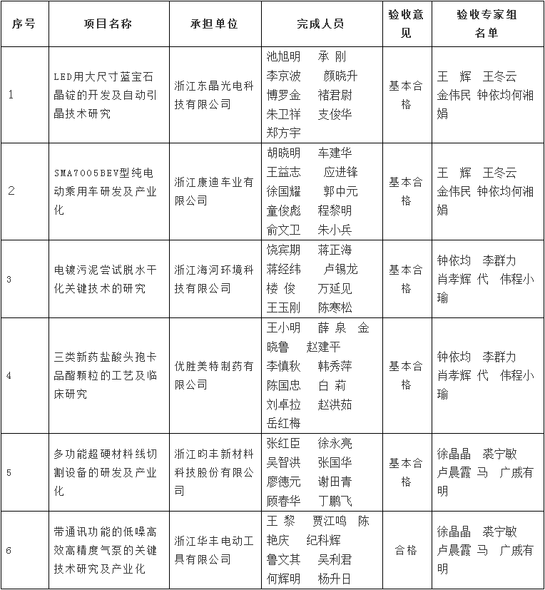 根據《金華市級科技計劃項目驗收管理辦法》(金市科字〔2015〕83號)規(guī)定,現將浙江東晶光電科技有限公司、浙江康迪車業(yè)有限公司、浙江海河環(huán)境科技有限公司、優(yōu)勝美特制藥有限公司、浙江昀豐新材料科技股份有限公司、浙江華豐電動工具有限公司承擔的《LED用大尺寸藍寶石晶錠的開發(fā)及自動引晶技術研究》、《SMA7005BEV型純電動乘用車研發(fā)及產業(yè)化》、《電鍍污泥嘗試脫水干化關鍵技術的研究》、《三類新藥鹽酸頭孢卡品酯顆粒的工藝及臨床研究》、《多功能超硬材料線切割設備的研發(fā)及產業(yè)化》、《帶通訊功能的低噪高效高精度氣泵的關鍵技術研究及產業(yè)化》6個市級科技計劃項目驗收結果予以公示,接受社會監(jiān)督,公示期從2018年7月20日至7月27日止。