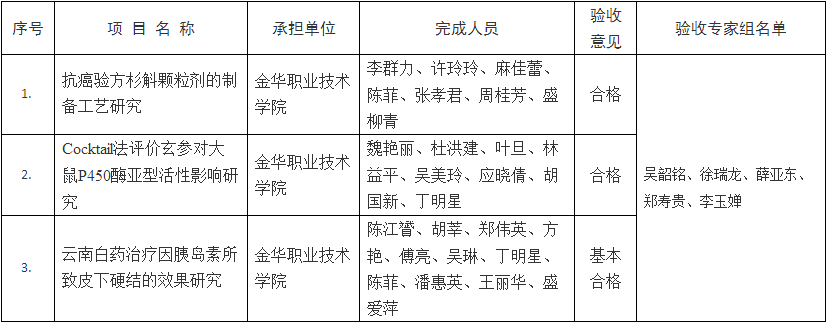 根據(jù)《金華市級(jí)科技計(jì)劃項(xiàng)目驗(yàn)收管理辦法》(金市科字〔2015〕83號(hào))規(guī)定,現(xiàn)將金華職業(yè)技術(shù)學(xué)院承擔(dān)的《抗癌驗(yàn)方杉斛顆粒劑的制備工藝研究》市級(jí)科技計(jì)劃項(xiàng)目驗(yàn)收結(jié)果予以公示,接受社會(huì)監(jiān)督,公示期從2018年7月23日至2018年7月29日止。任何單位和個(gè)人對(duì)驗(yàn)收意見持有異議的,應(yīng)當(dāng)在公示期內(nèi)書面向市科技局提出異議,單位應(yīng)采用書面形式并加蓋公章,個(gè)人應(yīng)采用實(shí)名提出異議。