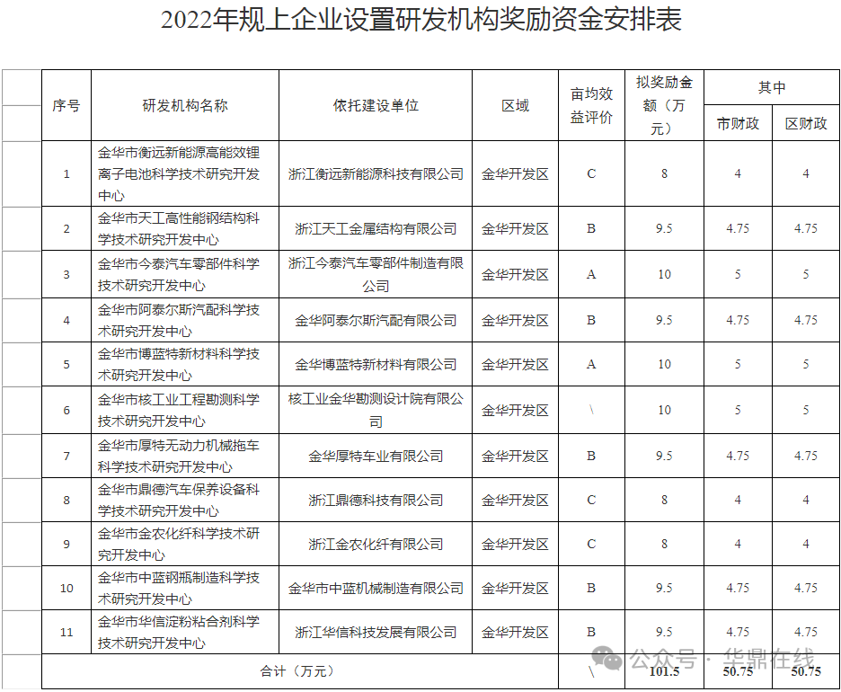 根據(jù)《中共金華市委科技強(qiáng)市建設(shè)領(lǐng)導(dǎo)小組關(guān)于加快補(bǔ)齊科技創(chuàng)新短板的政策意見》(金委科領(lǐng)〔2022〕1號(hào))等文件精神,依據(jù)《金華市科學(xué)技術(shù)局關(guān)于公布2022年度第四批金華市科學(xué)技術(shù)研究開發(fā)中心備案名單的通知》(金市科〔2022〕91號(hào))、《關(guān)于公布2022年度市區(qū)工業(yè)企業(yè)畝產(chǎn)效益綜合評(píng)價(jià)結(jié)果的通知》(金市評(píng)價(jià)辦〔2023〕1號(hào)),擬下達(dá)2022年規(guī)上企業(yè)設(shè)置研發(fā)機(jī)構(gòu)獎(jiǎng)勵(lì)資金,總金額101.5萬元。以上資金接受社會(huì)監(jiān)督,公示期為自公示之日起7個(gè)工作日。任何單位和個(gè)人有異議的,應(yīng)當(dāng)在公示期內(nèi)書面向市科技局提出,單位應(yīng)加蓋公章,個(gè)人應(yīng)署實(shí)名。